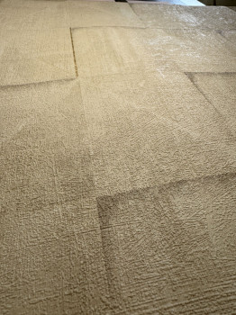 Fein geprägte, beige-graue geometrische Vliestapete mit Vinyloberfläche, 3D-Fliesenimitation, goldene Details.