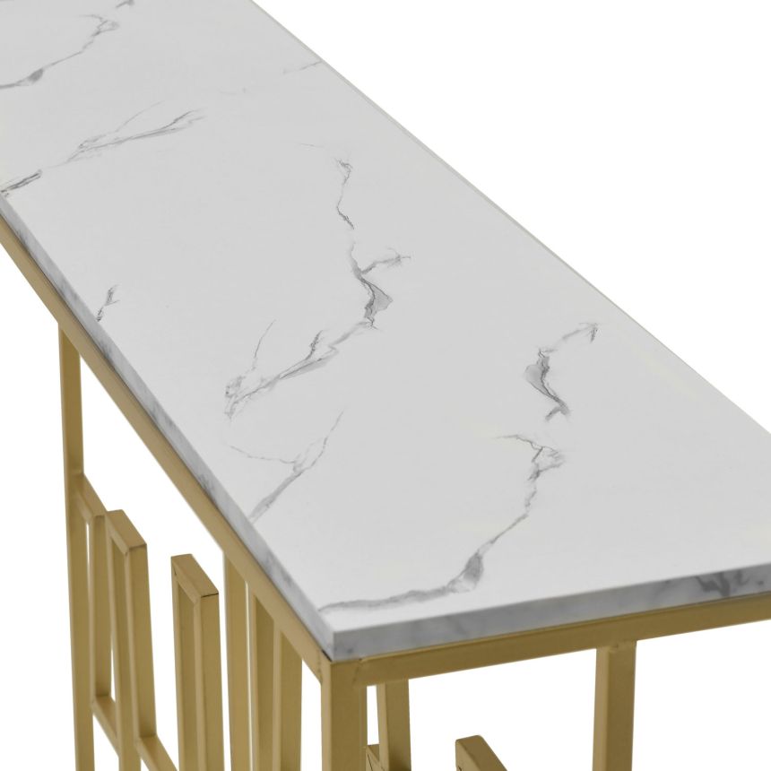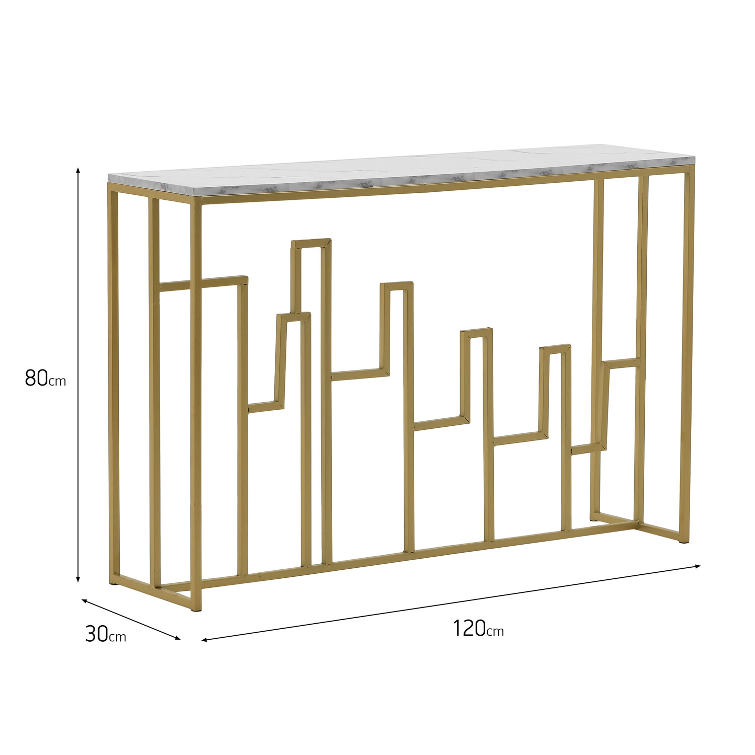 • Der Konsolentisch mit weißer Platte und goldener Struktur stellt eine Kombination aus Eleganz und Funktionalität dar. Eine tolle Ergänzung für Ihren Eingangsbereich oder Ihr Wohnzimmer. Metall/Holz.