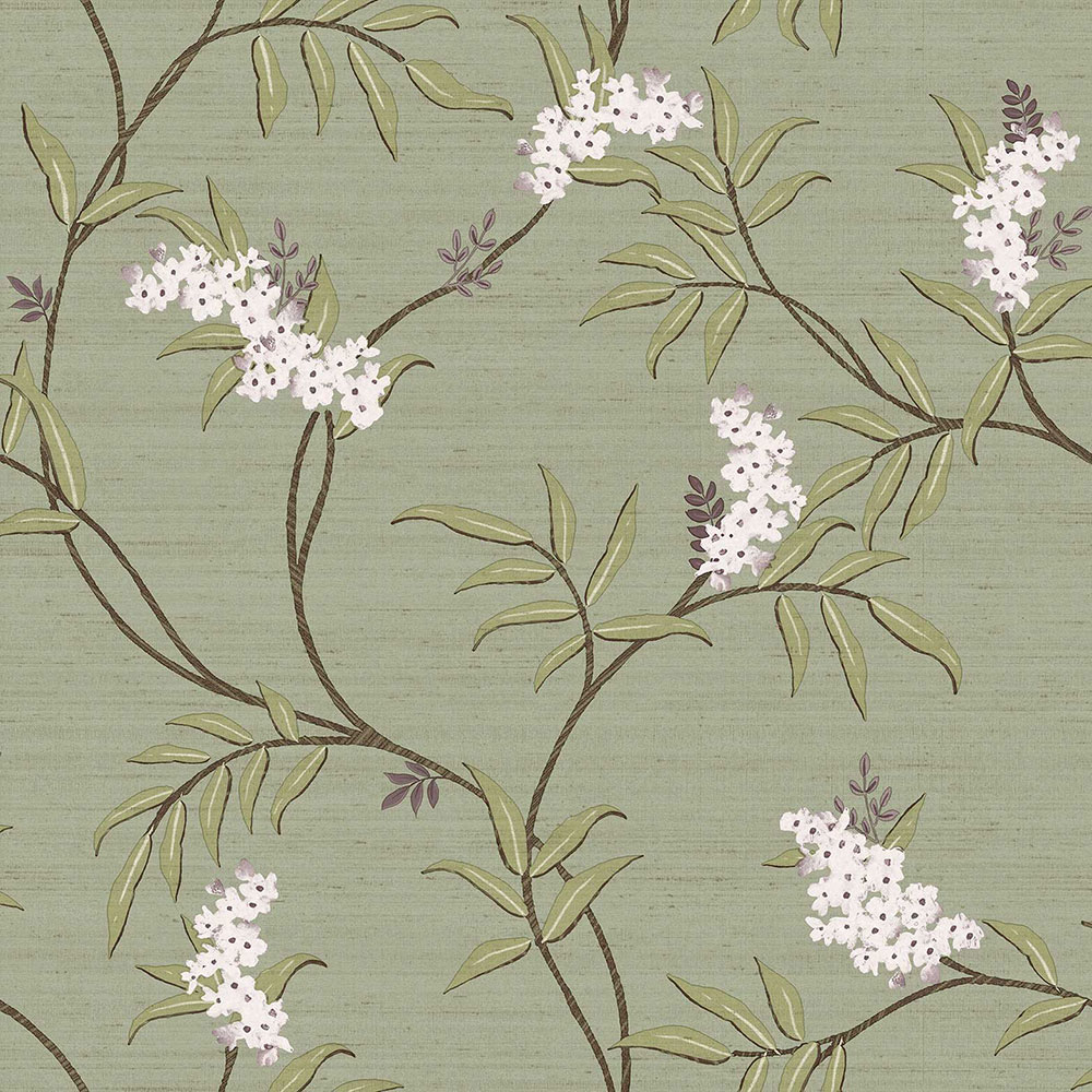 Olivgrüne Vliestapete mit Vinyloberfläche, weicher Stoffeffekt mit blühenden Zweigen in Metallic-Grün-, Braun- und Fliedertönen.