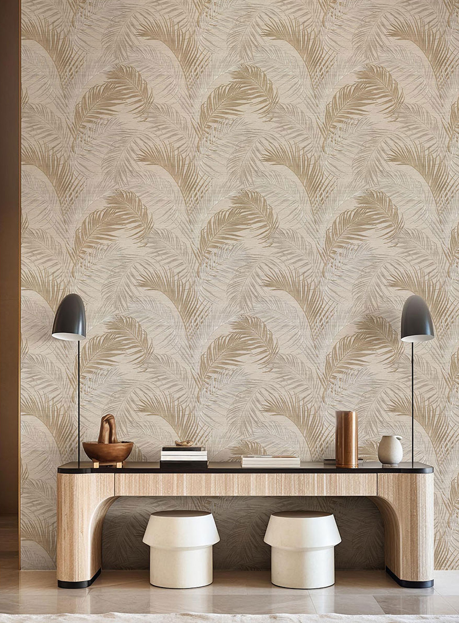 Luxuriöse Vliestapete mit Vinyloberfläche, geprägte Palmblattmotive, Beige- und Goldtönen.