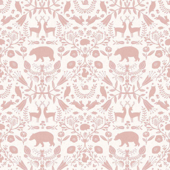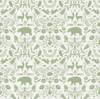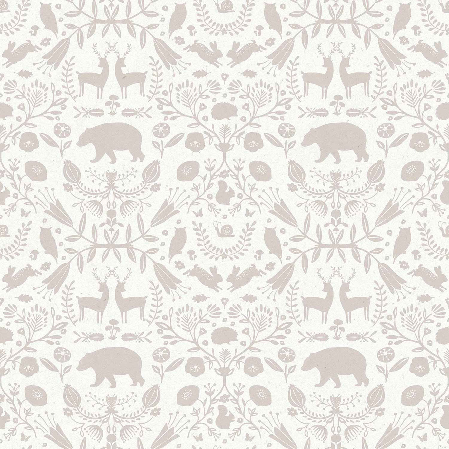 Grauweiße Vliestapete, Motive von Tieren und Blumen.