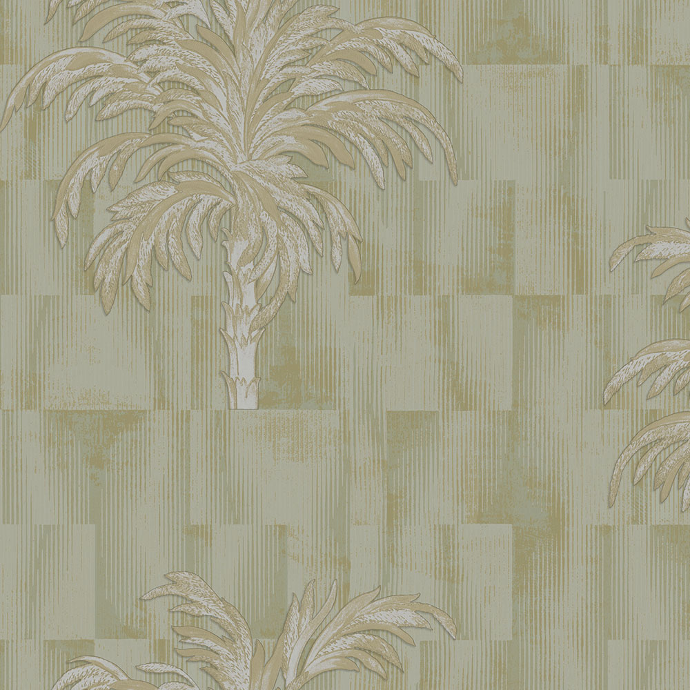 Luxuriöse grüne Vliestapete mit Vinyloberfläche, gröberer Streifenstruktur, Palmenmotiv.