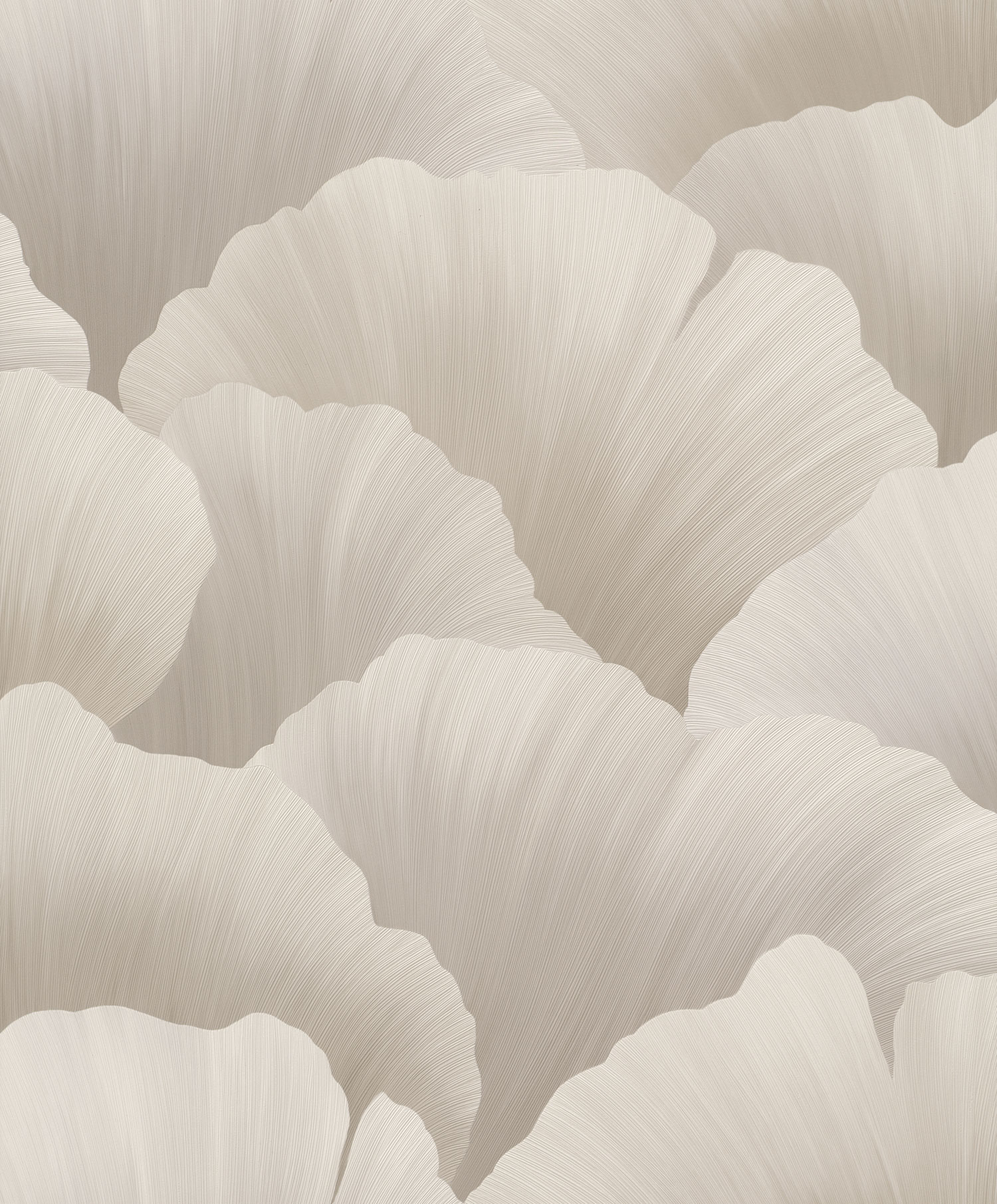Geprägte Vliestapete, Ginkgoblätter in Grau-Beige-Tönen.