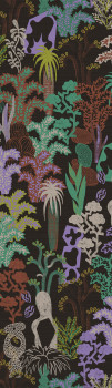 Vliestapete, grobe Stoffstruktur, Pflanzenmotive, Schwarz-, Grün-, Lila-, Braun- und Grautöne.