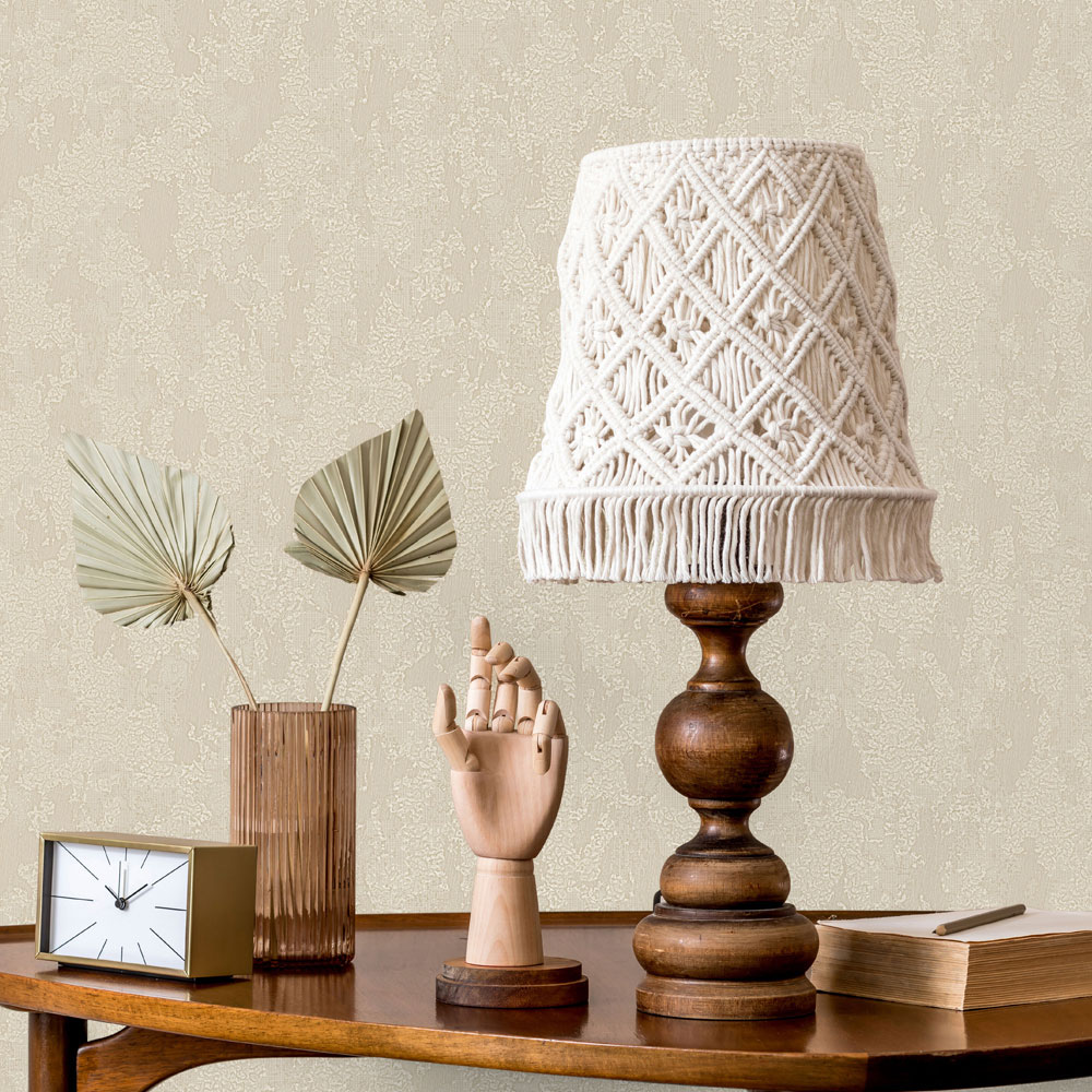 Luxuriöse hellbeige Vliestapete, barockes Stuckmuster mit winzigem Glitzer.