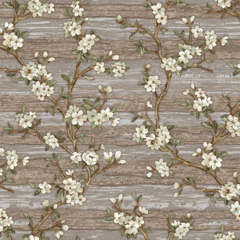 Luxuriöse Vliestapete mit Vinyloberfläche. braun-grün-cremefarbenem Blumenmuster auf markant geprägtem, halbglänzendem, braunem und braun-grauem Hintergrund.