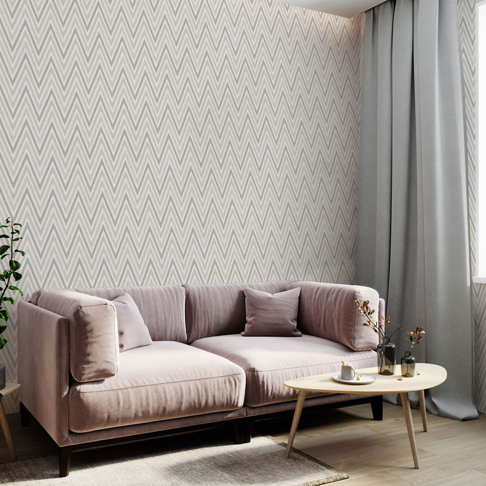 Vliestapete mit Vinyloberfläche, Zickzack-Muster in den Farbtönen Hellgrau, Beige und Grau-Silber.