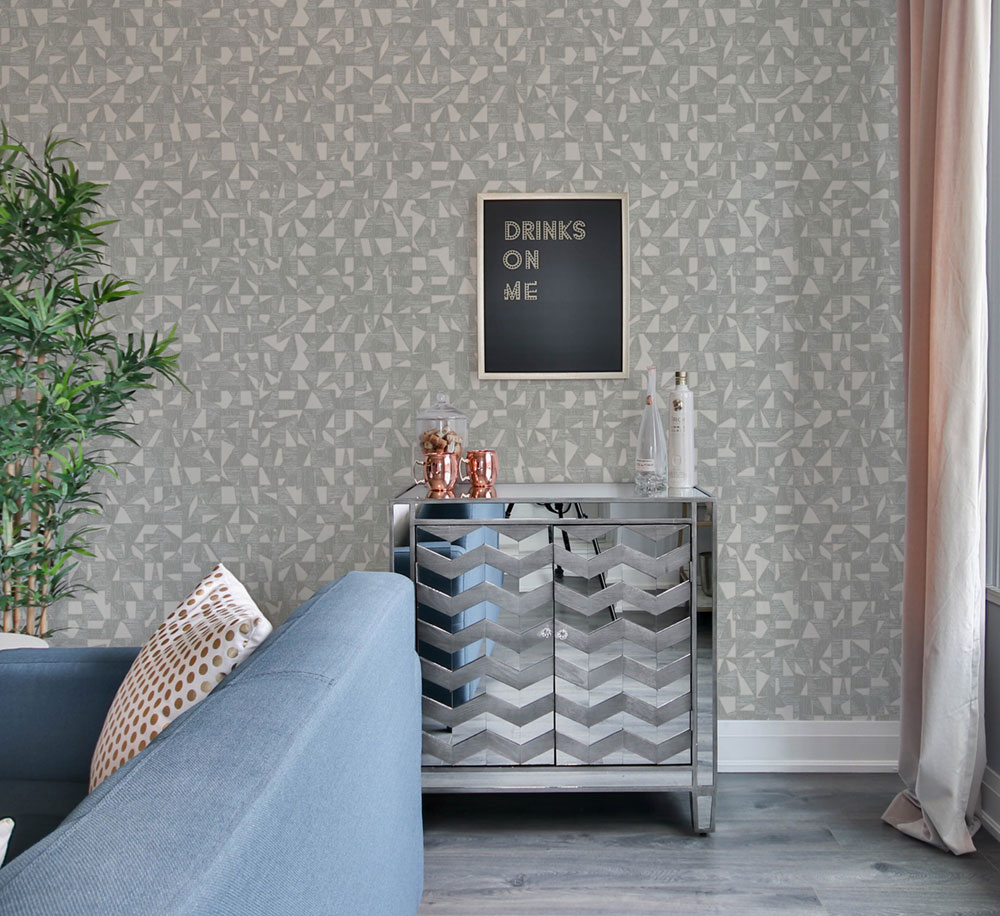 Geometrische Vliestapete mit Vinyloberfläche, effektvoller Strukturwechsel, Grau-Silber-Töne.