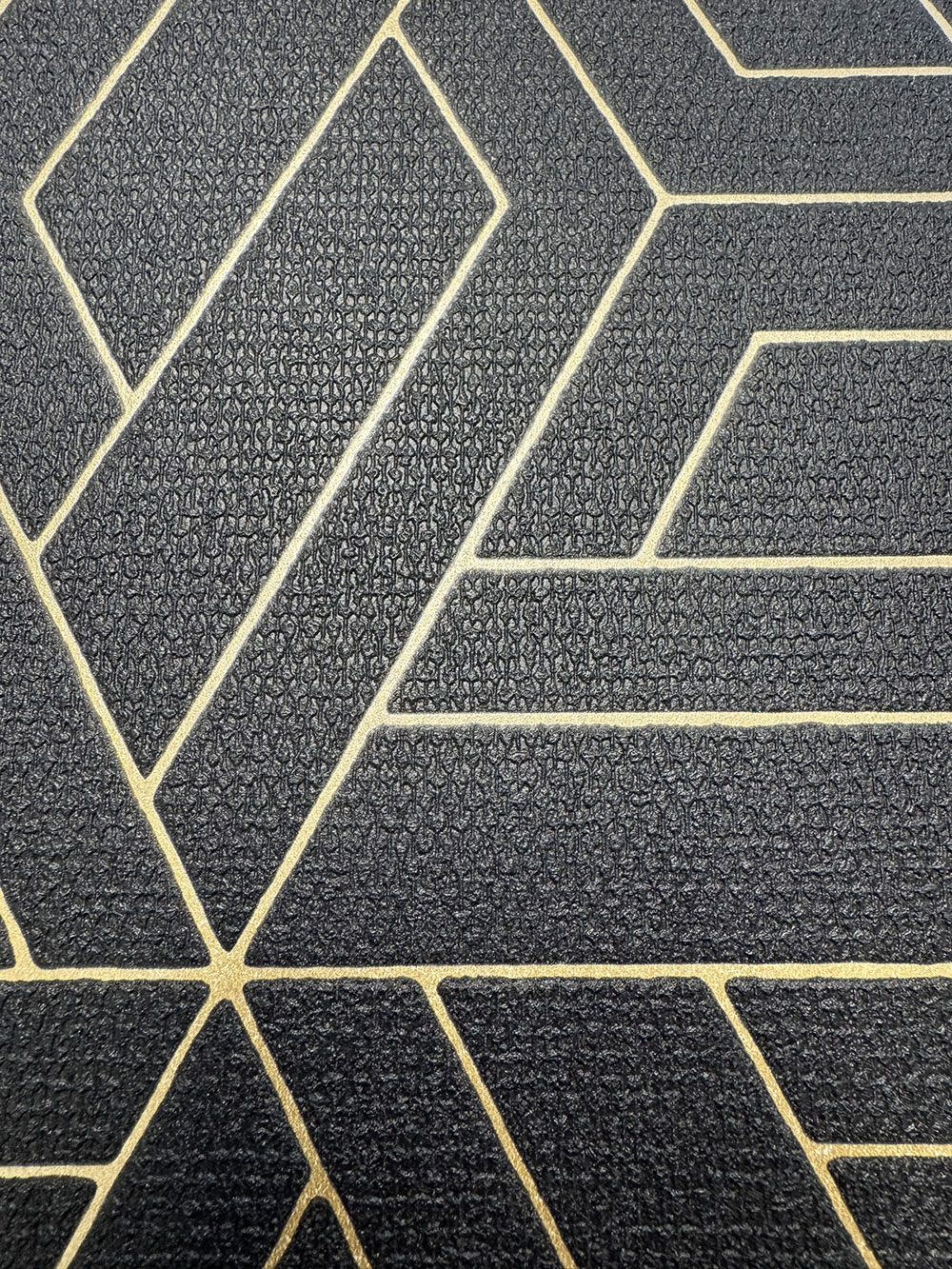 Schwarze geprägte geometrische Vliestapete, goldene Konturen.