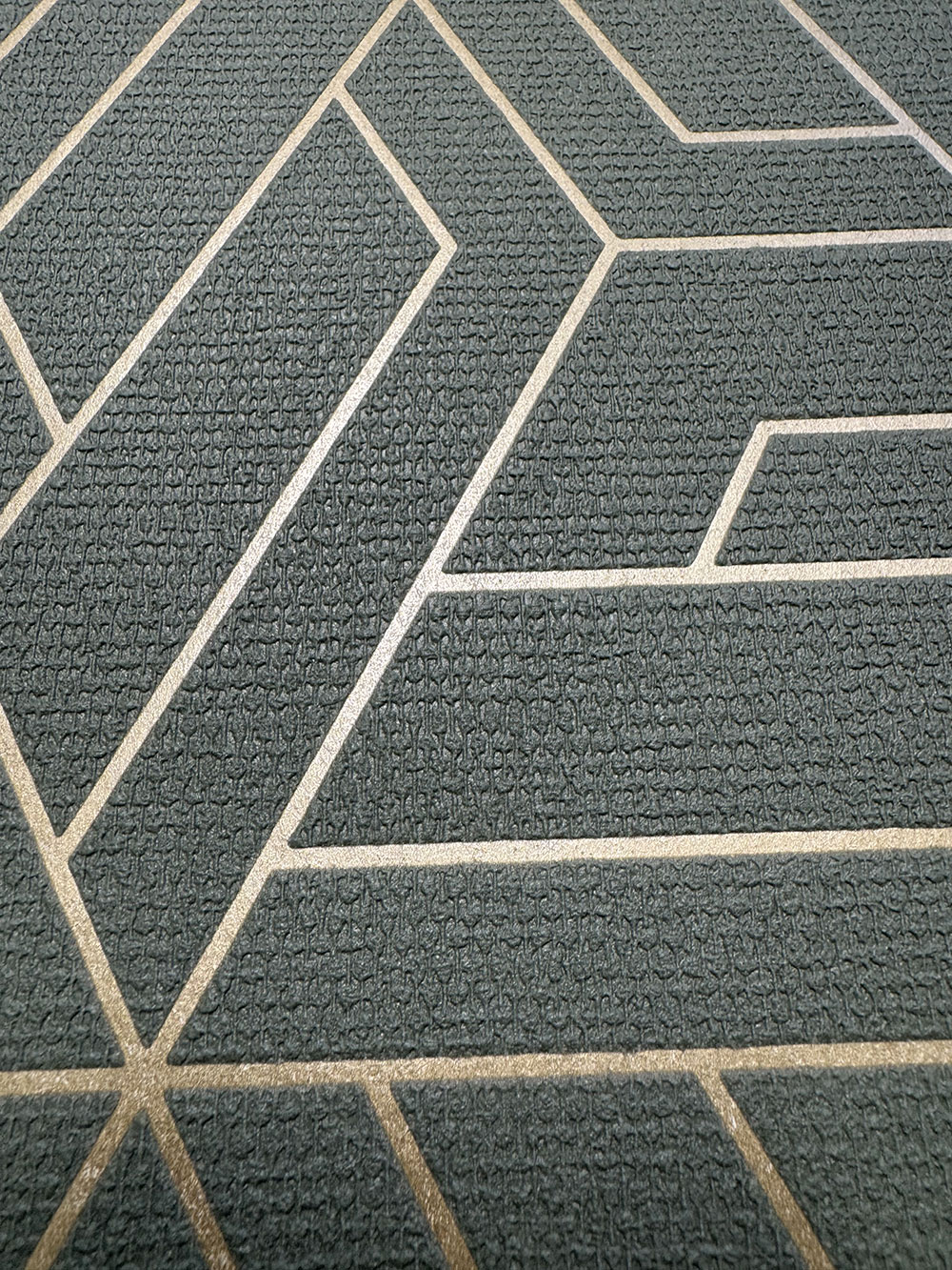 Grüne geprägte geometrische Vliestapete, goldene Konturen.