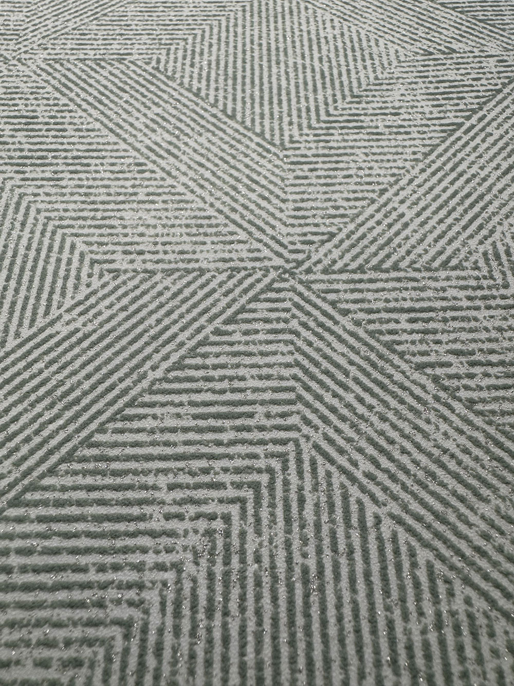 Geometrische Vliestapete, Grüntöne, kleiner metallischer Glitzer.