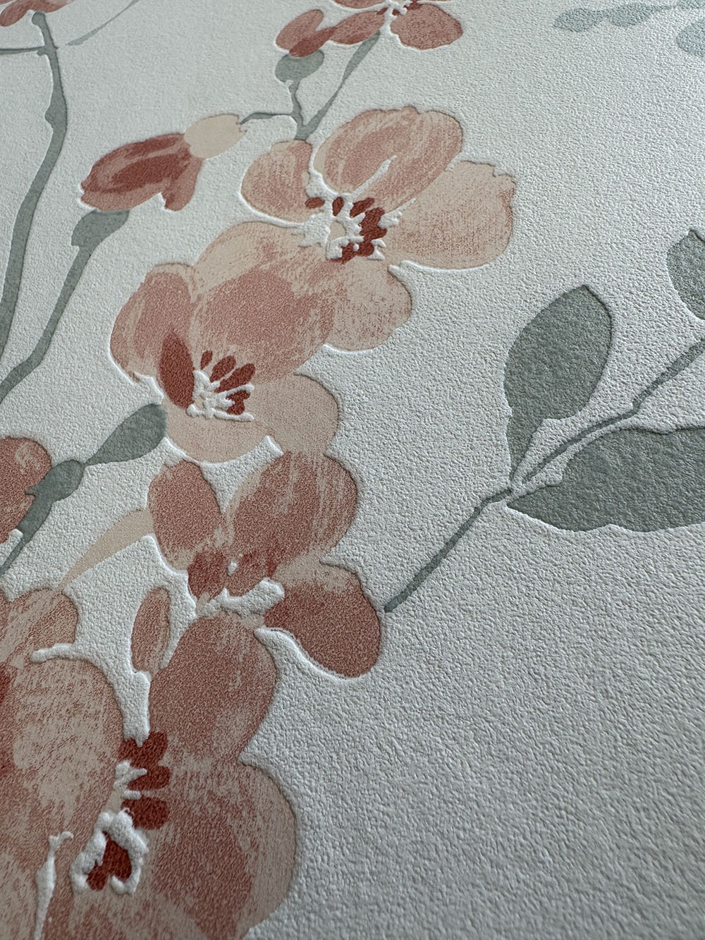 Cremefarbene Vliestapete mit geprägtem floralem Muster in Grün- und Rosatönen.