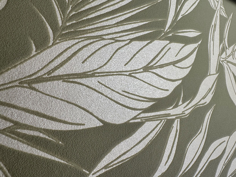 Matte grüne Vliestapete, geprägte glänzende beige Blätter.