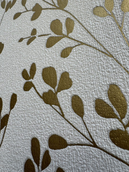 Strukturierte cremefarbene Vliestapete, geprägte goldene Zweige.
