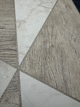 Geometrische Vliestapete, Braun-, Beige- und Grauschwarztöne. Holz- und Marmormotiv, beige metallische Konturen.