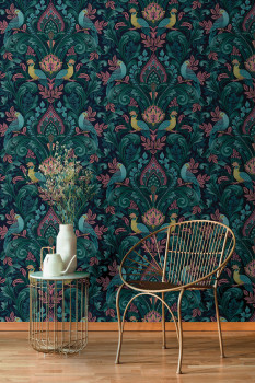 Original Vliestapete - ornamentale Naturmuster und Vögel; Grün-, Blau- und Schwarztöne, sandige Textur.