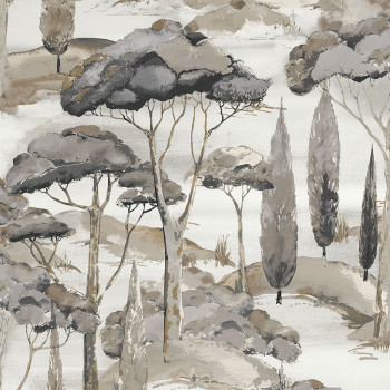 Grüne Vliestapete, Landschaftsmotiv mit Bäumen; feine Sandstruktur.