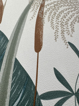 Vliestapete, Motive aus Blättern in Grün- und Brauntönen, Libellen und goldenen Gräsern. Feine Sandstruktur.