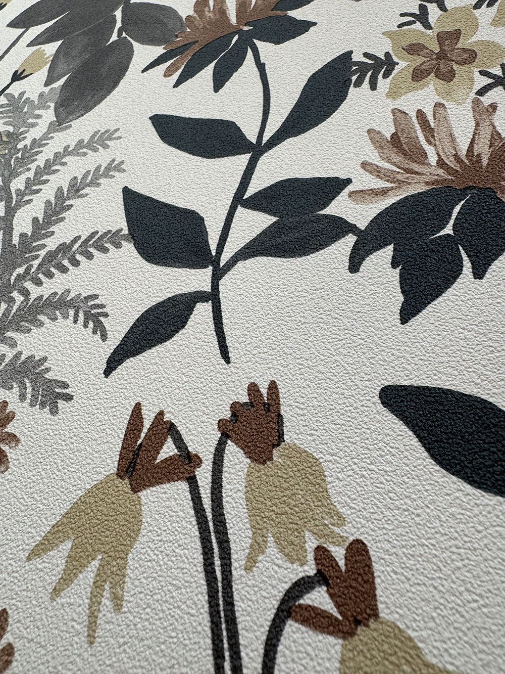 Vliestapete, Blumenmotive in Grau- und Brauntönen. Feine Sandstruktur.
