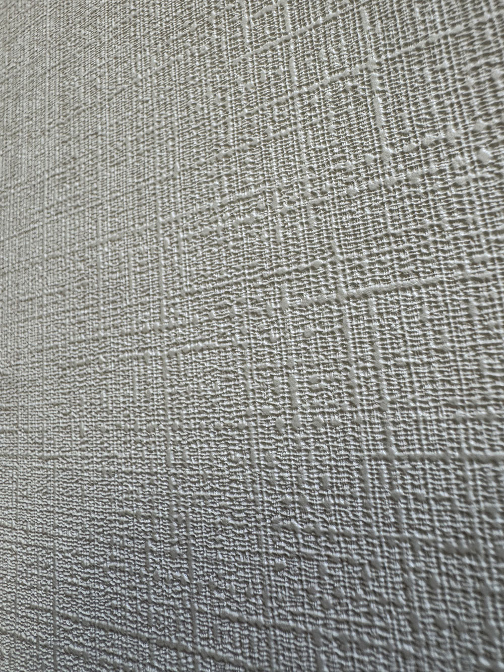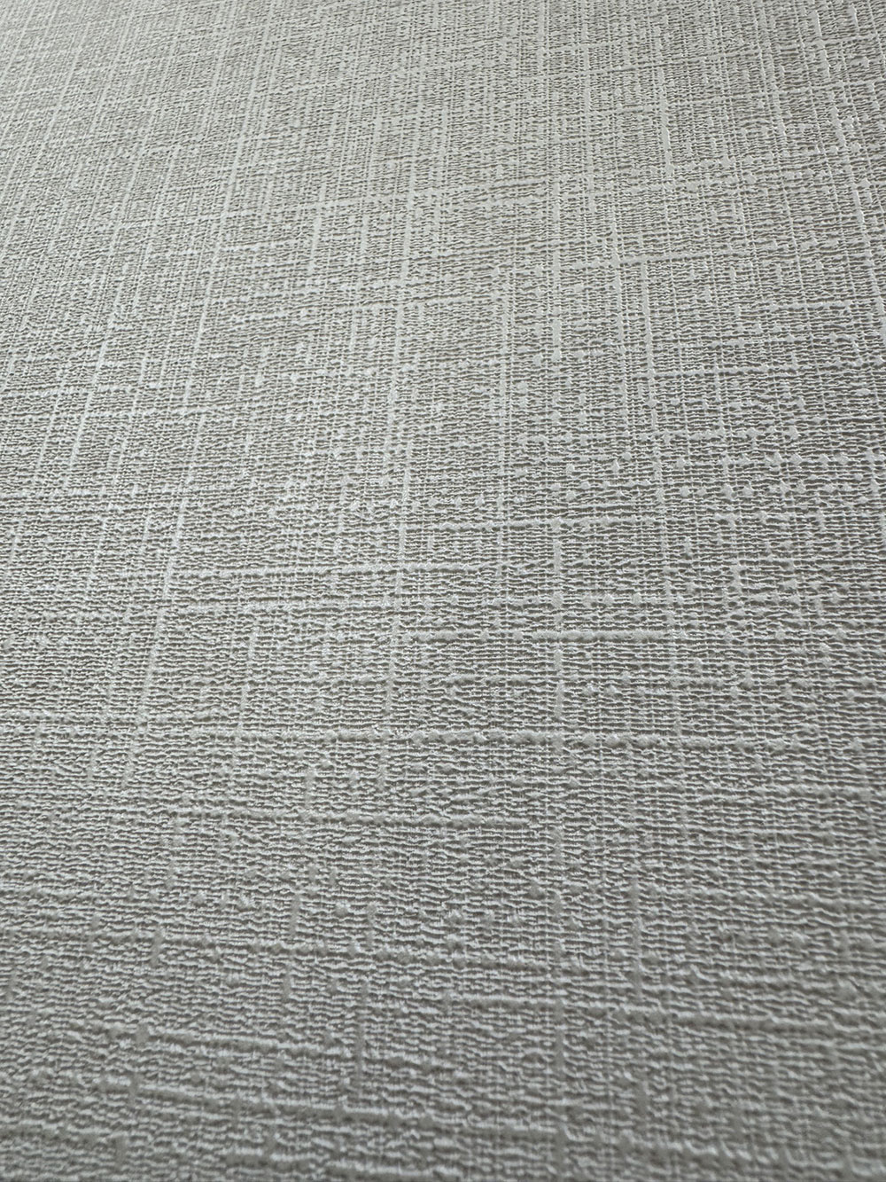 Hellgraue Vliestapete mit Vinyloberfläche, feine Stoffstruktur.