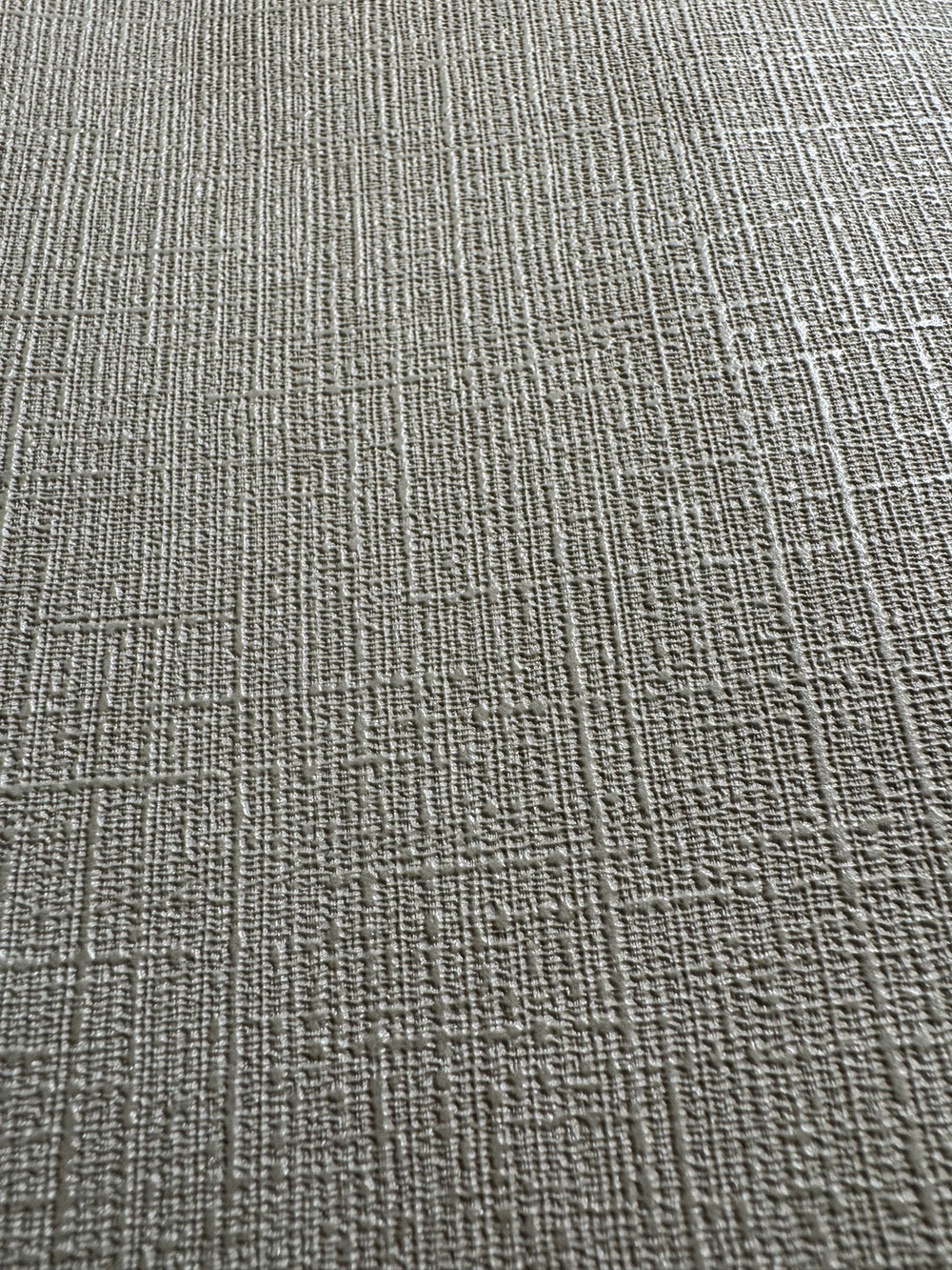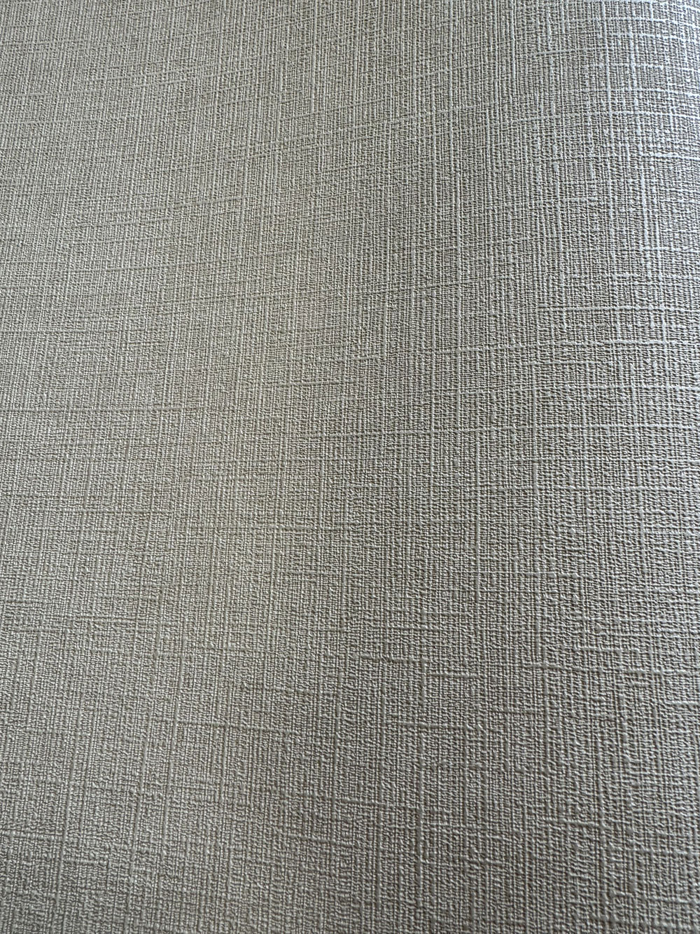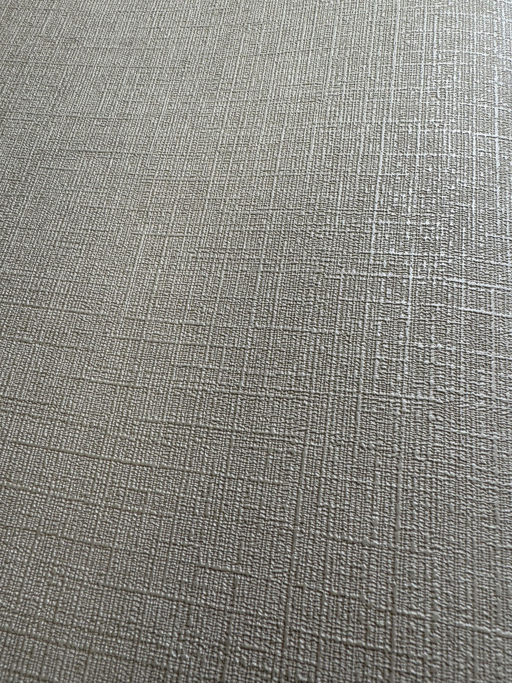 Beige Vliestapete mit Vinyloberfläche, feine Stoffstruktur.