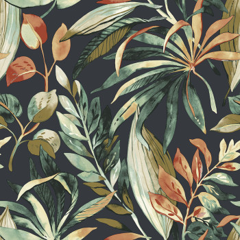 Schwarze Vliestapete, Blättermotive in Grün-, Braun- und Orangetönen.