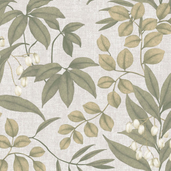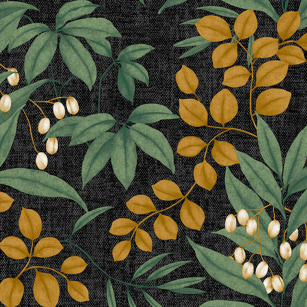 Schwarze Vliestapete, Zweige und Blätter in Grün- und Ockertönen, das Aussehen eines gröberen Stoffes.