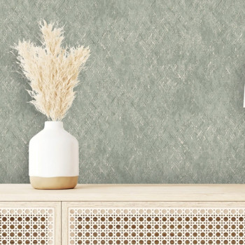 Vliestapete mit Vinyloberfläche, Design inspiriert von Schlangenhaut, Grün- und Blaugrüntöne mit metallischen Akzenten.