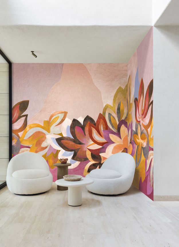 Vlies-Fototapete, florales Muster in den Farbtönen Burgund, Lila, Orange, Blau