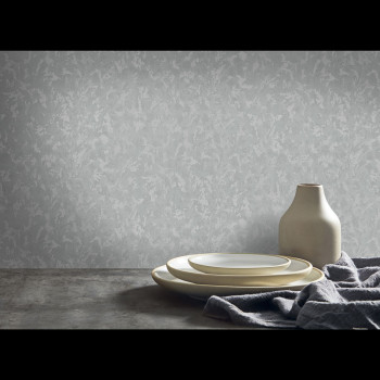Luxuriöse Vliestapete mit Vinyloberfläche, halbglänzende Grau-Silber-Töne, Dekor Stuckputz.