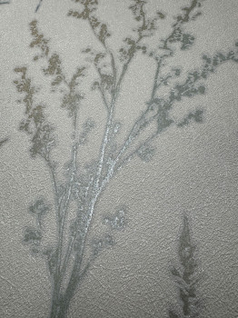 Vliestapete mit Vinyloberfläche, Muster aus Wiesenblumen und Gräsern in halbglänzenden Weiß, Grau, Blau und Grüntönen – feine Faserstruktur.