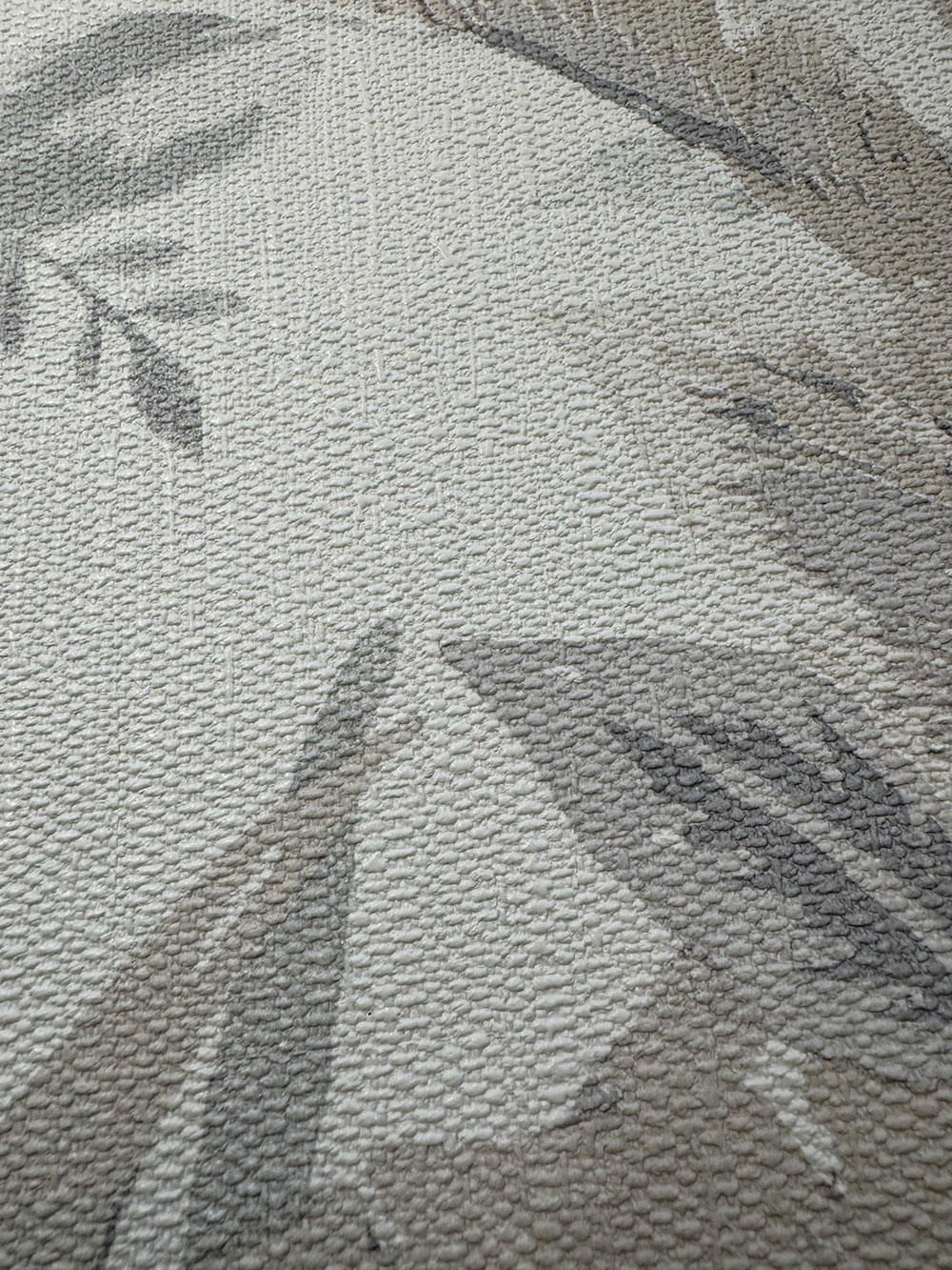 Vliestapete mit Vinyloberfläche, Imitation von gröberem Stoff, Blättermotive in Grau-Beige-Tönen.