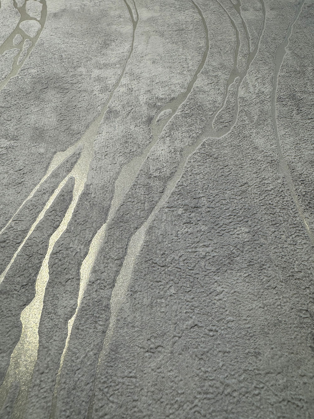 Vliestapete mit Vinyloberfläche, Stuck-/Betonimitation in Grau-Weiß-Tönen, geprägte Metallic-Linien.