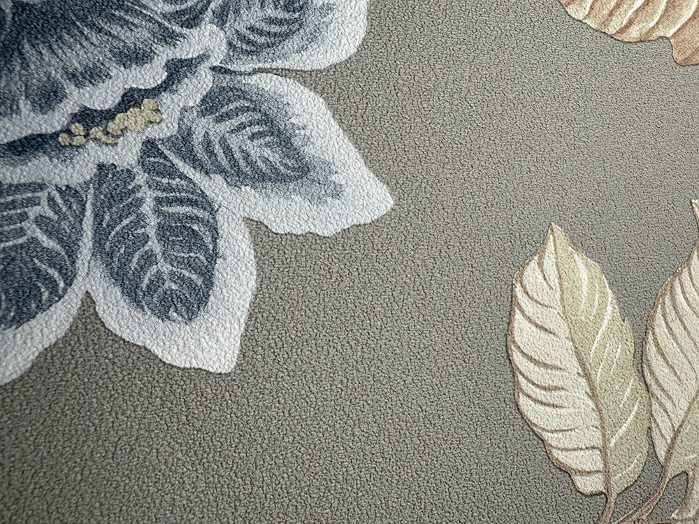 Vliestapete mit Vinyloberfläche, graugrüner Hintergrund, Blumen in Braun-, Grün-, Blau- und Rosatönen.