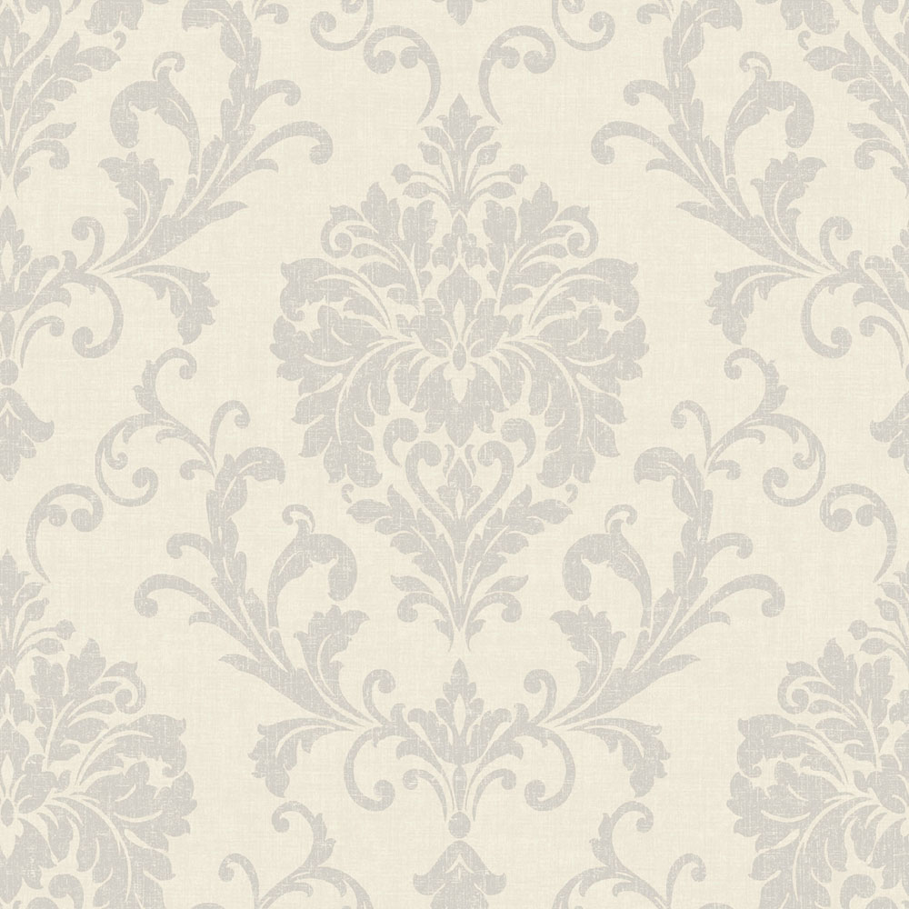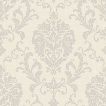 Vliestapete mit Vinyloberfläche, feine Stoffstruktur, ornamentales Barockmuster, Grautöne.