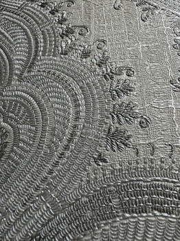 Luxuriöse Vliestapete mit Vinyloberfläche, Barockmuster in Weiß und Grau-Silber.