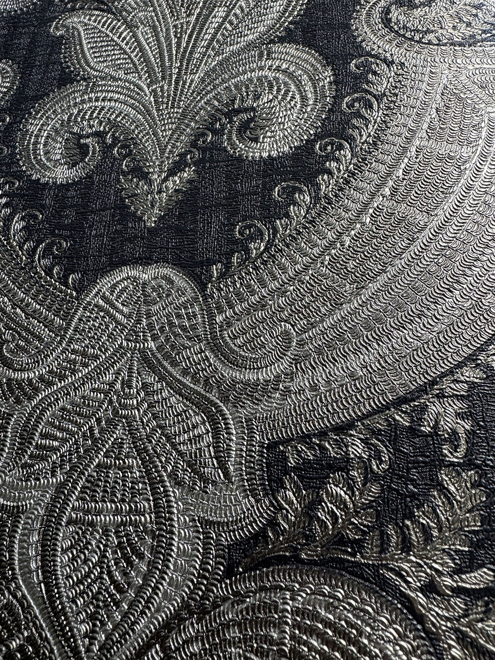 Luxuriöse Vliestapete mit Vinyloberfläche, Barockmuster in halbglänzenden Schwarz- und Silbertönen.