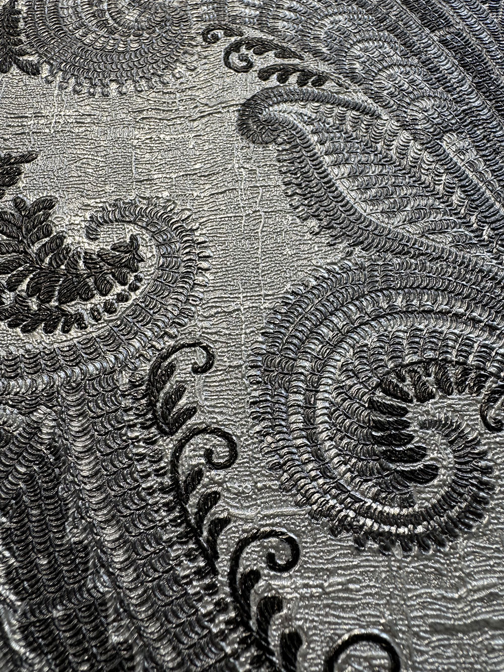 Luxuriöse Vliestapete mit Vinyloberfläche, Barockmuster in halbglänzenden Silber- und Grautönen.