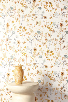 Vliestapete, elfenbeinfarbener Hintergrund, Blumenmuster in Braun-, Silber- und Goldtönen, feine Textur.