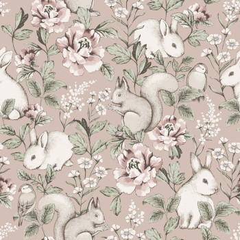 Kindertapete mit einem beigen Hintergrund und Motiven von Tieren und Pflanzen.