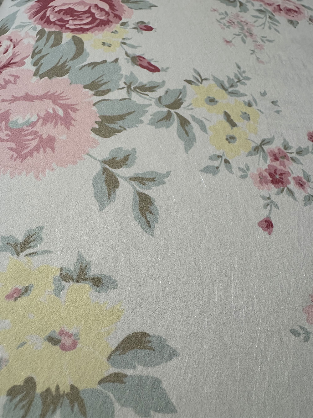 Vliestapete für die Wand, pastellblauer Hintergrund, Blumenmuster in Rosa-, Grün- und Gelbtönen.
