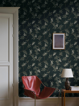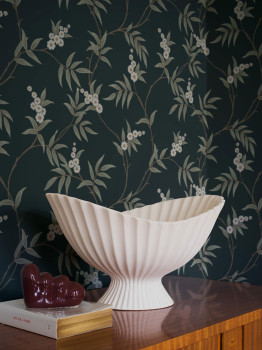 Vliestapete, schwarzer Hintergrund, blühende Zweige in Grün-, Braun-, Creme- und Pastellrosa-Tönen.