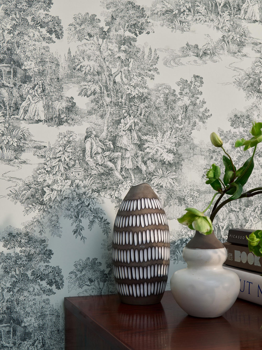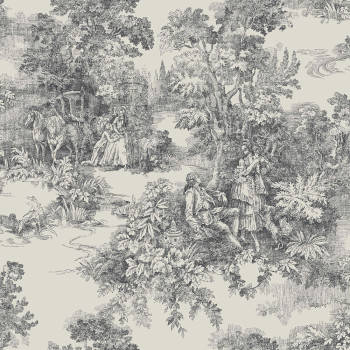 Vliestapete, schwarzer Aufdruck auf hellgrau-beigem Hintergrund – ein romantisches Motiv, inspiriert von den historischen Toile-de-Jouy-Stoffen.