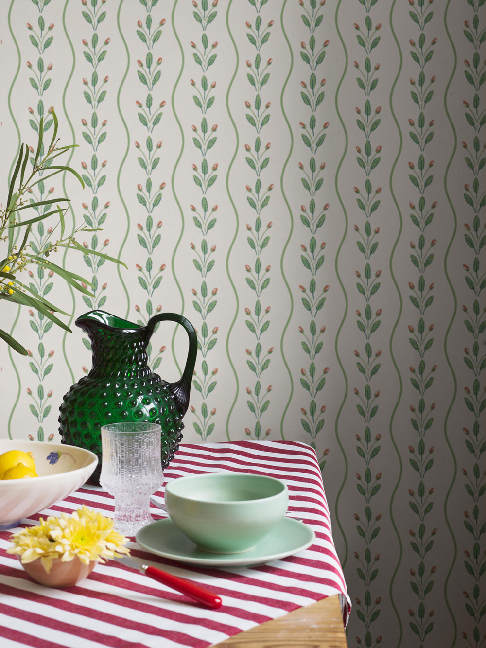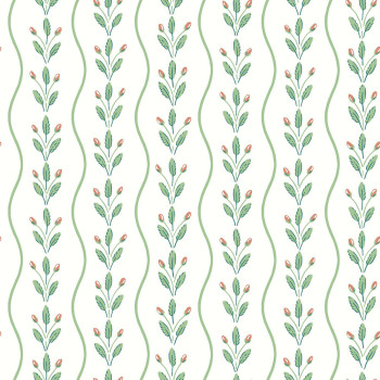 Vliestapete für die Wand, weißer Hintergrund, grüne Wellenlinien bilden Streifen; Muster aus Blättern und roten Früchten.
