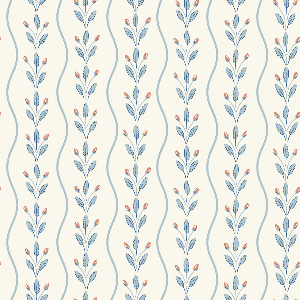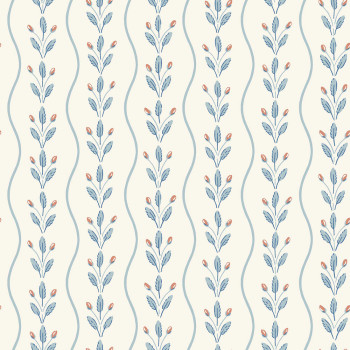 Vliestapete für die Wand, cremefarbener Hintergrund, blaue Wellenlinien bilden Streifen; Muster aus Blättern und roten Früchten.