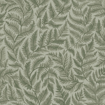 Vliestapete, grüner Hintergrund, dunkelgrüne Farnblätter.
