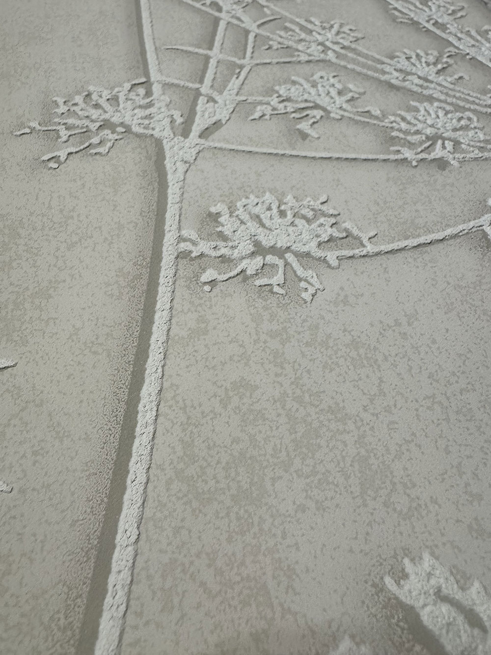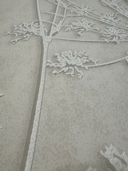 Tapete mit Muster aus blühenden Wiesengräsern in Creme- und Weißtönen – plastische Textur.