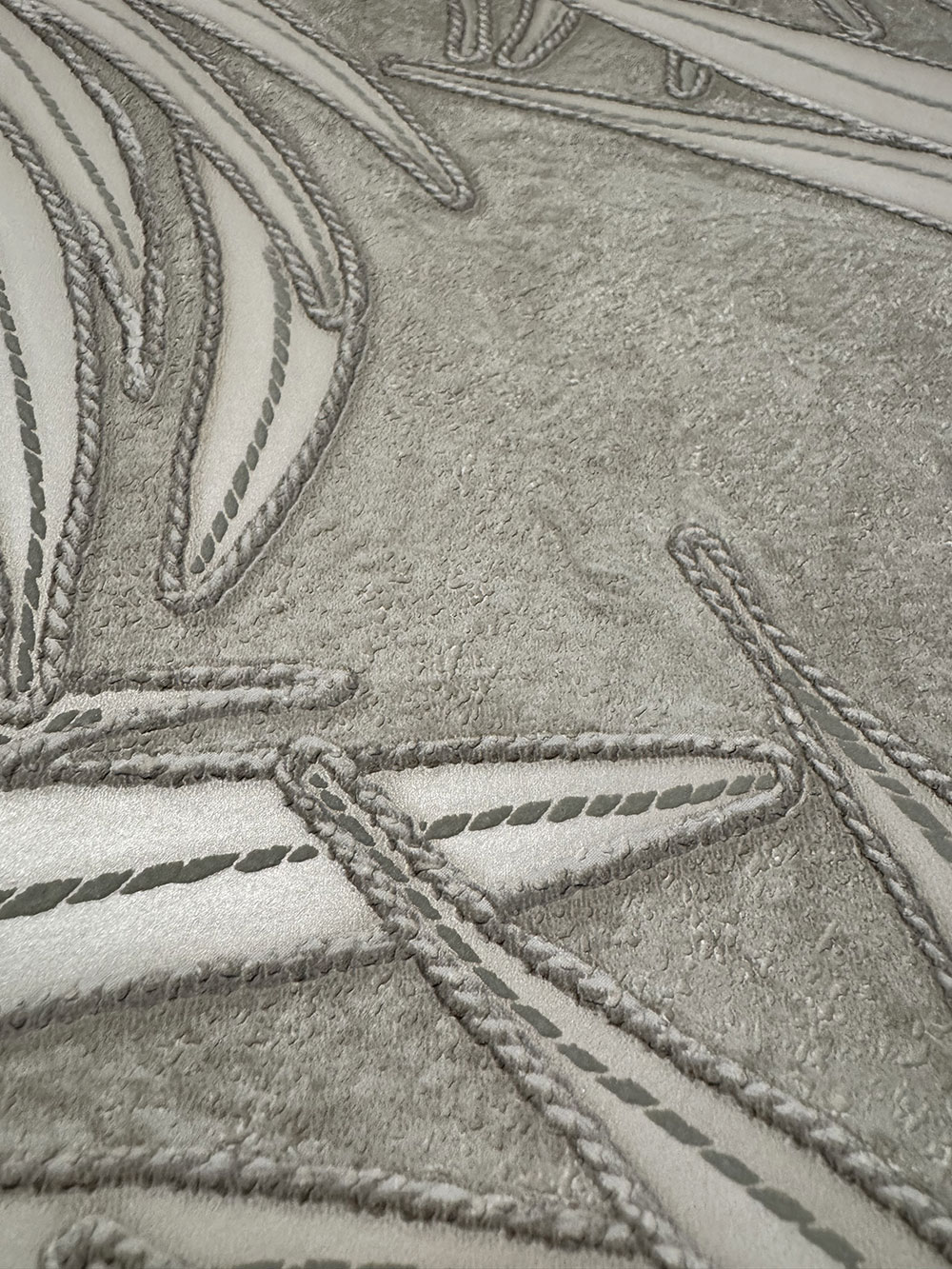 Tapete mit Blättermuster in Grau-Grün, glatte Blätter mit Stickeffekt und leicht plastischem Hintergrund.