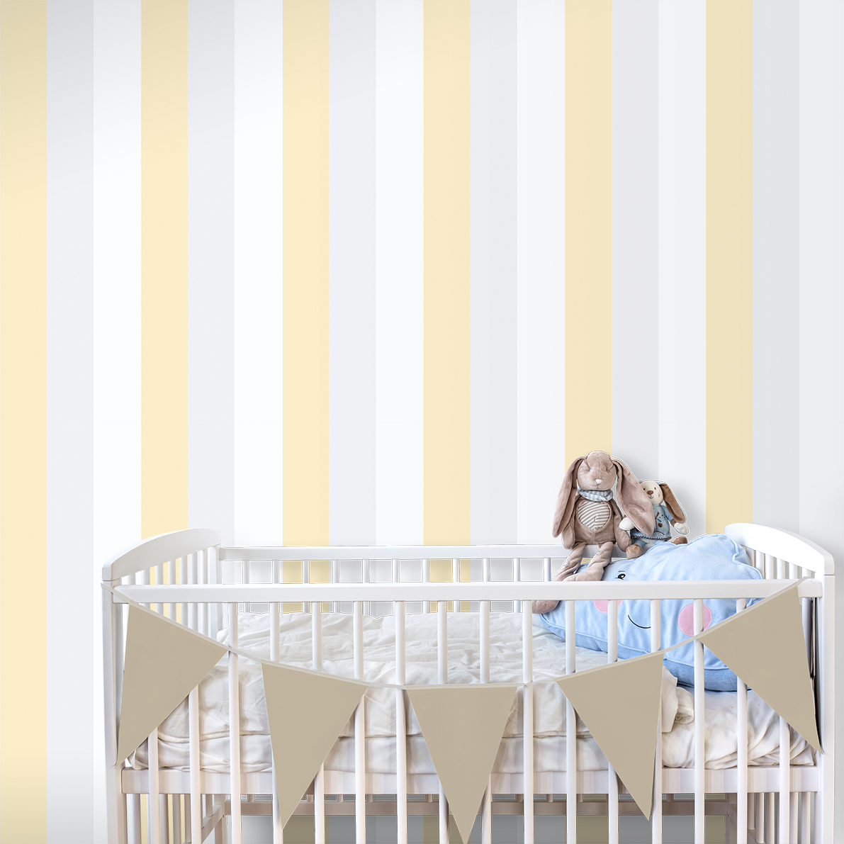 Aktuelle Trends gehen zu zeitlosen Streifen. Sie können mit gemusterten und einfarbigen Tapeten kombiniert werden oder einen Raum definieren und gemütlich trennen. Gestreifte weiß-grau-gelbe Papiertapete für Kinder.