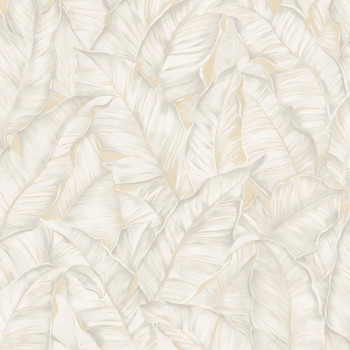 Luxus-Tapete mit Vinyloberfläche, plastische geprägte Blätter in Weiß-, Grau- und Beigetönen mit goldenen Reflexen.